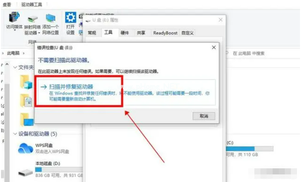 步驟4:這時會彈出U盤錯誤檢查窗口界面,點擊“掃描并修復(fù)驅(qū)動器”,耐心等待掃描恢復(fù)即可。