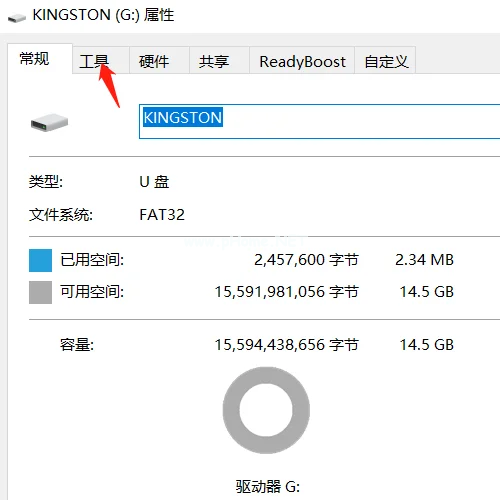 3、在U盤磁盤屬性窗口上方點(diǎn)擊“工具”。