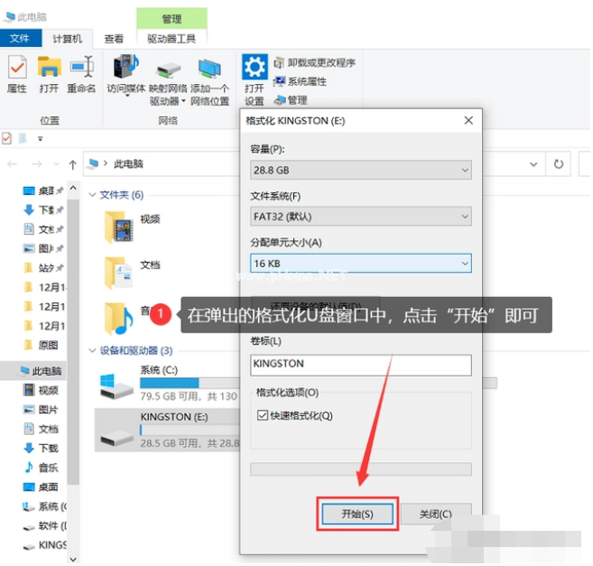 2、在彈出的U盤格式化窗口,選中【快速格式化】,點(diǎn)擊【開始】。格式化結(jié)束,U盤里面的病毒也被清理好了。