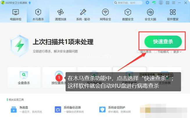 2、選擇【快速查殺】,讓該軟件對(duì)電腦進(jìn)行病毒查殺。