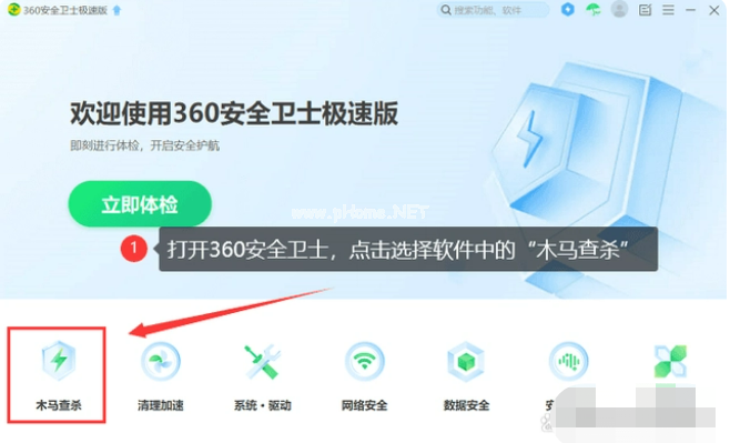 1、首先打開軟件360安全衛(wèi)士,找到并點(diǎn)擊【木馬查殺】。