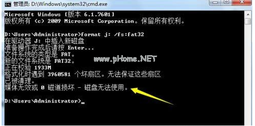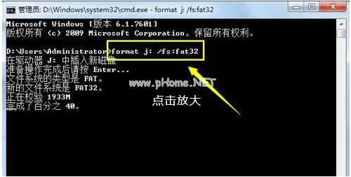 2、接著輸入好“format j: /fs:fat32”(其中j代表U盤(pán)所在盤(pán)符)并按回車(chē)鍵執(zhí)行U盤(pán)格式化操作就可以啦。