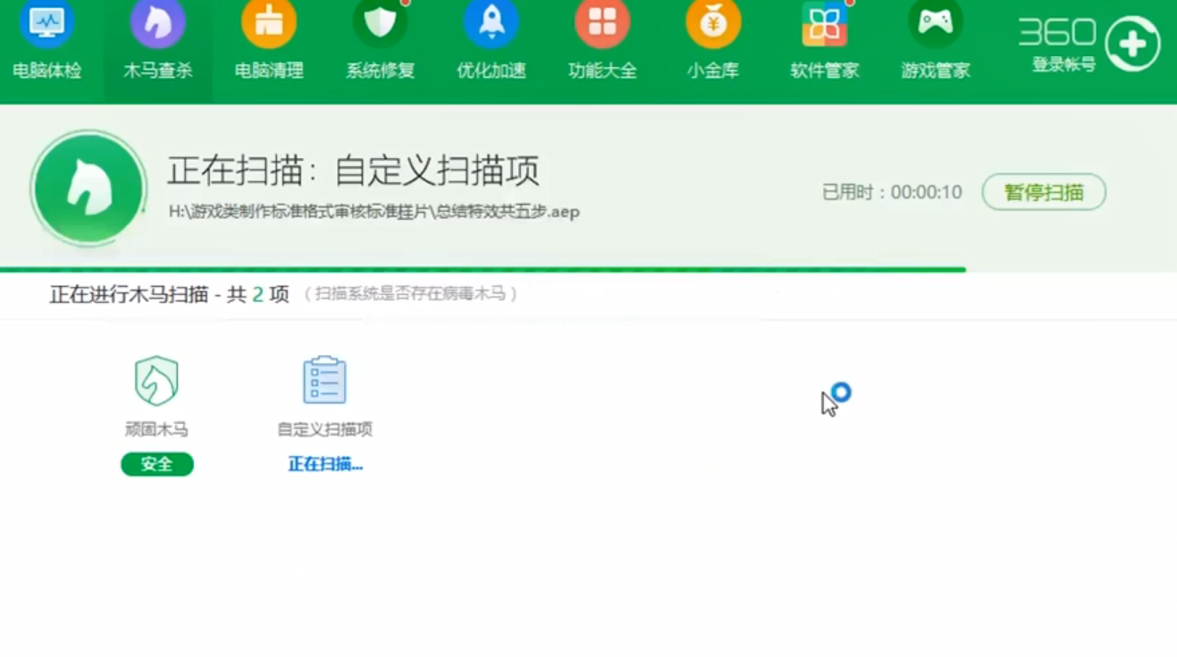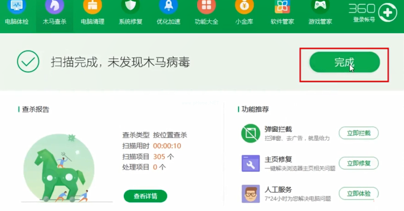 2、會進入360界面,自動進行殺毒,等待殺毒完成,點擊“完成”即可。