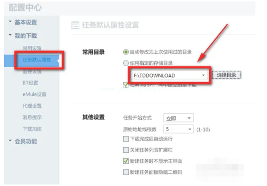 2.然后點(diǎn)擊左側(cè)的“我的下載”“任務(wù)默認(rèn)屬性”。我們可以看到迅雷默認(rèn)下載的東西在F盤的TDDOWNLOAD文件夾下。