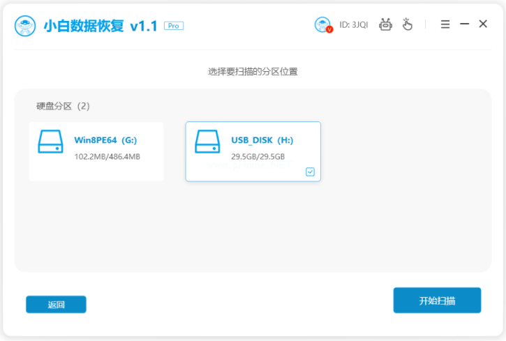 2、選擇要掃描的u盤分區(qū),開始掃描。
