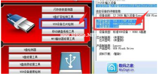 2、雙擊運行“萬能版U盤量產(chǎn)工具”,從彈出的程序主界面中,點擊“USB設(shè)備芯片檢測”按鈕。