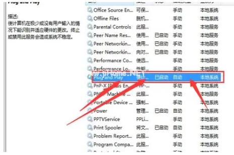 4、找到Plug and Play,觀察是否開啟,如果是關(guān)閉狀態(tài)開啟即可修復解決問題。