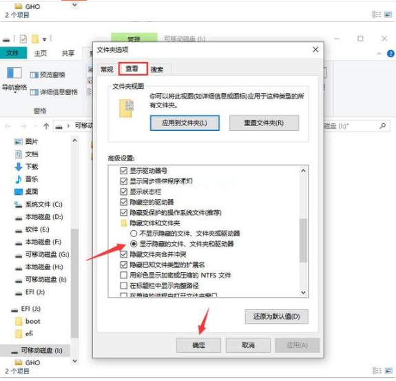 3、又或者點(diǎn)擊旁邊的選項(xiàng),打開文件夾選項(xiàng),點(diǎn)擊查看,勾選“顯示隱藏的文件、文件夾和驅(qū)動(dòng)器”,點(diǎn)擊確定按鈕。