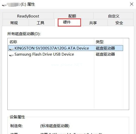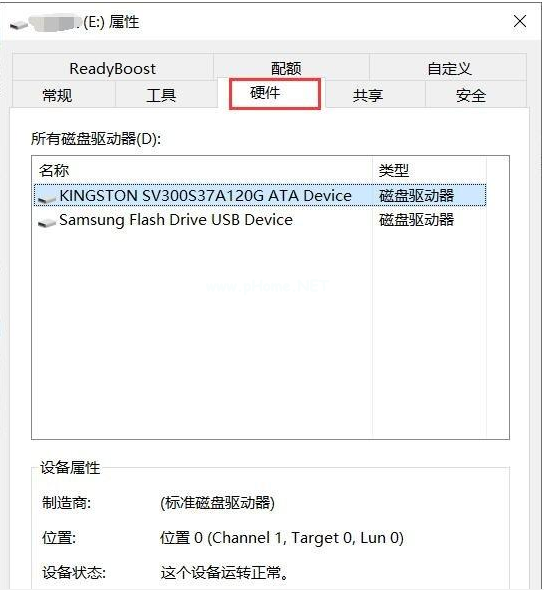 1、首先選擇U盤符右鍵-屬性-硬件;