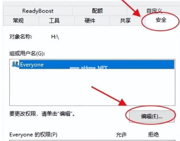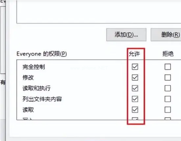 3、在打開的窗口中,我們選中Everyone,勾選everyone的權(quán)限中的完全控制,依次確定即可。