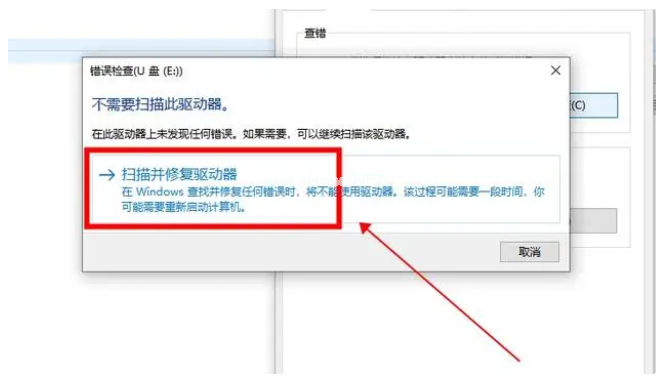3、在彈出的對話框中,點擊“掃描并修復(fù)驅(qū)動器”,等待掃描修復(fù)完成后即可解決由邏輯壞道引起的u盤寫保護。