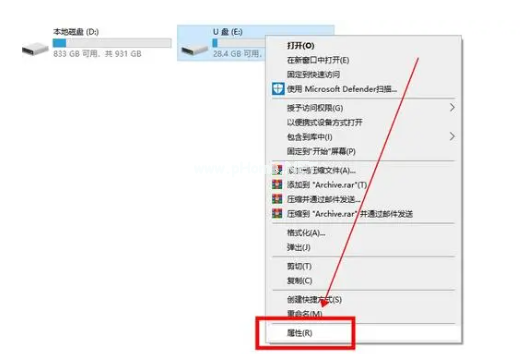 1、在U盤盤符上鼠標右鍵,在彈出的菜單中點擊選擇“屬性”;