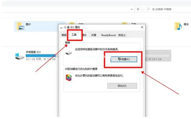 2、在U盤屬性窗口中,找到“工具”,鼠標點擊下面的“檢查”按鈕;