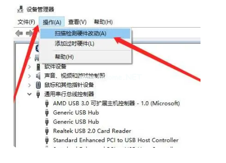 6、點擊“操作”,彈出“掃描檢測硬件更改”;