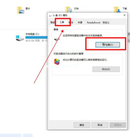 ?2、選擇工具點(diǎn)擊檢查在U盤屬性中選擇“工具”,鼠標(biāo)點(diǎn)擊“檢查”。