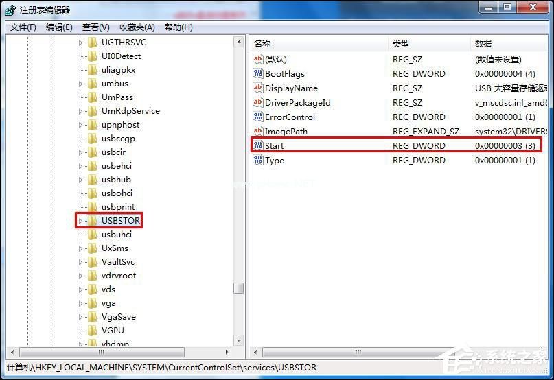 2、在注冊表編輯器界面,依次展開“HKEY_LOCAL_MACHINE-SYSTEM-CurrentControlSe-services--USBSTOR”,然后在右邊鍵值列表中找到并雙擊“Start”,如下圖所示:
