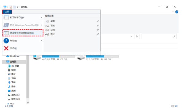 2. 點(diǎn)擊左上方的文件,在打開的下拉項(xiàng)中,選擇更改文件夾和搜索選項(xiàng)。