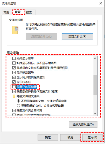 3. 在文件夾選項(xiàng)窗口界面中,切換到查看選項(xiàng)卡,在高級設(shè)置框中,找到并取消勾選隱藏空的驅(qū)動器,點(diǎn)擊應(yīng)用。