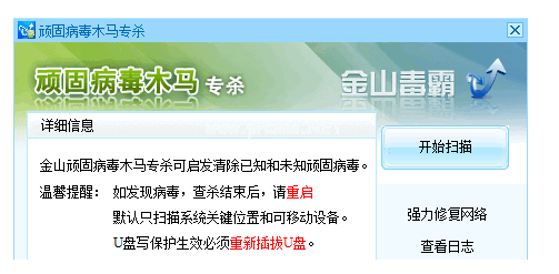 金山出品的專門針對U盤以及移動硬盤內(nèi)存卡類的病毒木馬專殺工具,先下載金山頑固專殺,主要針對上面的那些殺毒軟件無法殺死或者找出的病毒類型,所以它的適應(yīng)性稍微窄一點,但它能解決其他軟件不能修復(fù)解決的問題,所以算是一個補充的U盤殺毒軟件。