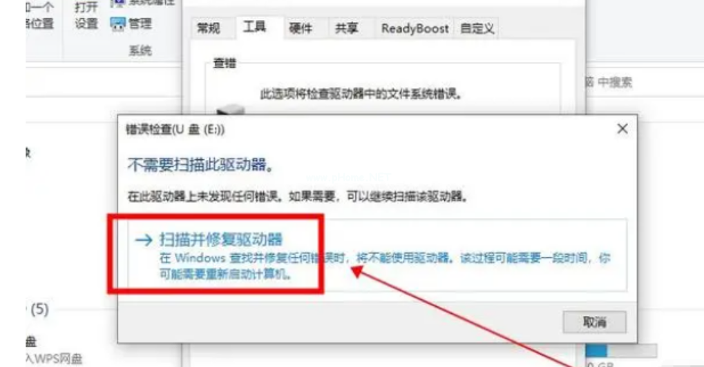 4、最后點擊“掃描并修復(fù)驅(qū)動器”,等待系統(tǒng)掃描U盤并修復(fù)U盤錯誤即可。