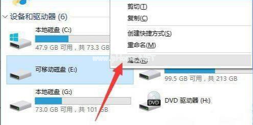 1、插入u盤,打開此電腦,右擊U盤盤符,在彈出的右鍵菜單中選擇“屬性”。