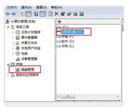 2、在計算機管理窗口界面中,展開“存儲”—“磁盤管理”的選項;