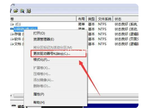 3、鼠標右鍵點擊無法正常顯示的u盤盤符,選擇“更改驅(qū)動器和路徑”的選項;