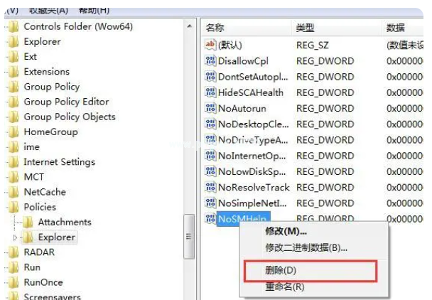 2、接著依次展開“HKEY_CURRENT_USER\Software\Microsoft\Windows\CurrentVersion\Policies\Explorer”,把“nodrives”鍵值刪除掉即可。