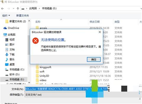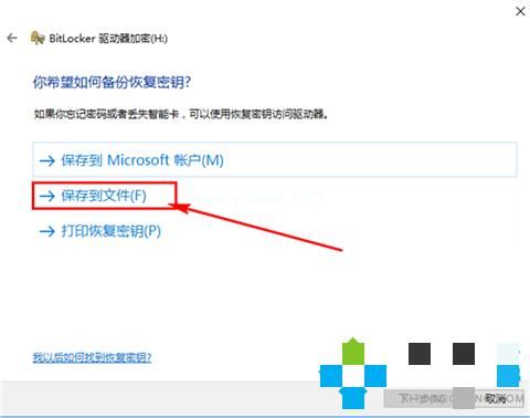4、選擇保存到文件。要注意的是,不能把恢復(fù)密鑰保存在非移動(dòng)驅(qū)動(dòng)器的根目錄下,也不能保存在已加密的移動(dòng)磁盤中。