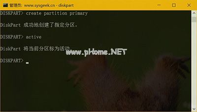6、使用如下命令創(chuàng)建一個新的主分區(qū)并標(biāo)記不活動分區(qū):create partition primary和active,之所以標(biāo)記為活動分區(qū),是為了方便將 Windows 系統(tǒng) ISO 映像放上去當(dāng)啟用 U 盤來用。