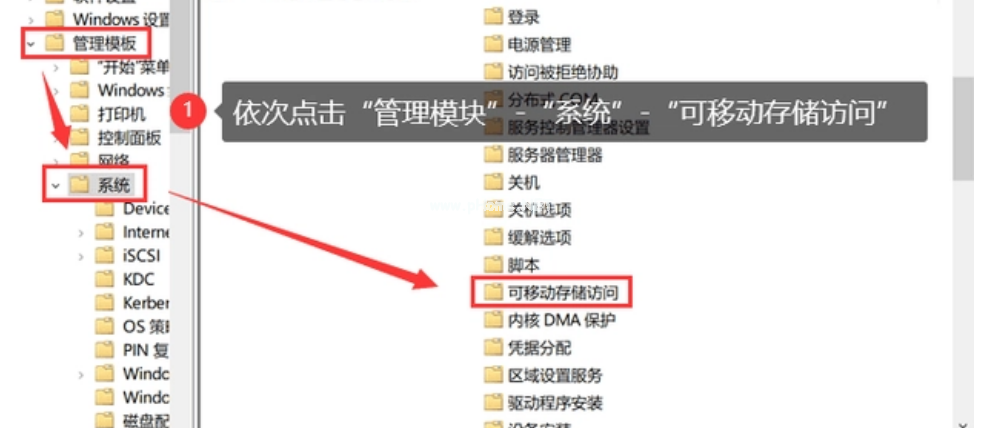 2、在打開的窗口,分別打開【管理模塊】-【系統(tǒng)】-【可移動存儲訪問】。保證【可移動磁盤:拒絕讀取權(quán)限】和【所有可移動磁盤:拒絕讀取權(quán)限】這兩個選項都是沒有被配置或者已經(jīng)被禁用。