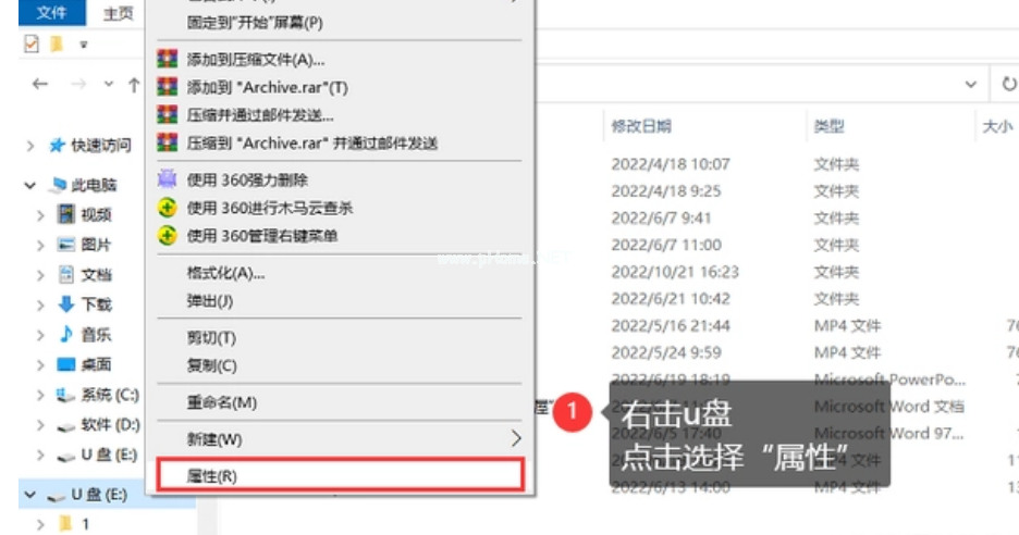 1、U盤與電腦連接成功,打開【此電腦】,在里面找到你要修復(fù)的磁盤:U盤。鼠標(biāo)右鍵單擊它,再選擇【屬性】;