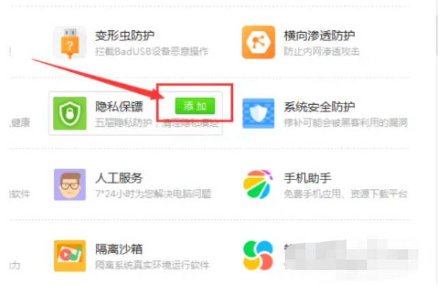 3.當(dāng)鼠標(biāo)移動到“隱私保鏢”圖標(biāo)時,出現(xiàn)“添加”圖標(biāo),此時點擊“添加”即可, 如圖所示。