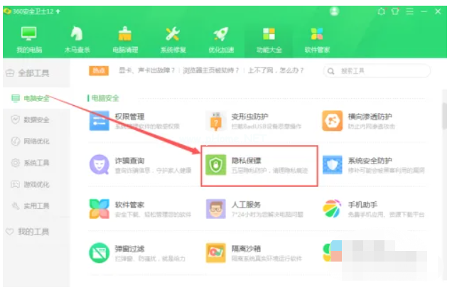 2.進(jìn)入“電腦安全”界面中,可以看到“隱私保鏢”功能,如圖所示。