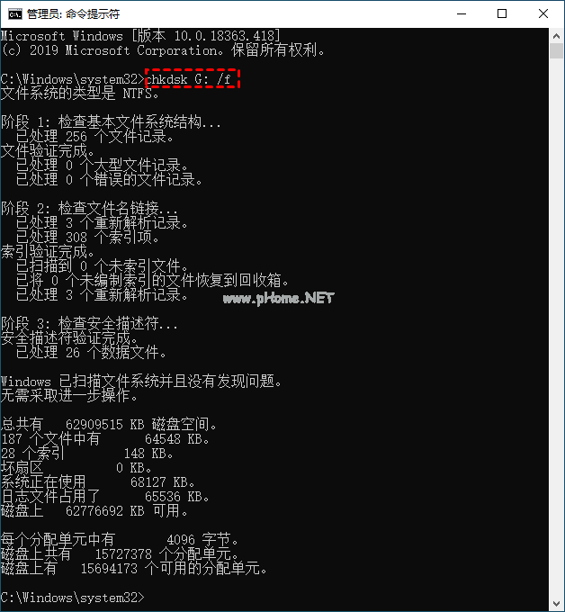 2. 依次輸入以下命令。輸入chkdsk G: /f并按回車。(字母G為U盤的驅(qū)動器號,根據(jù)具體情況修改。)此命令可以修復(fù)損壞或無法召喚的U盤。