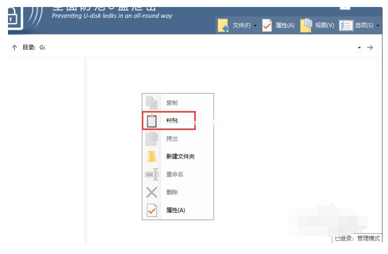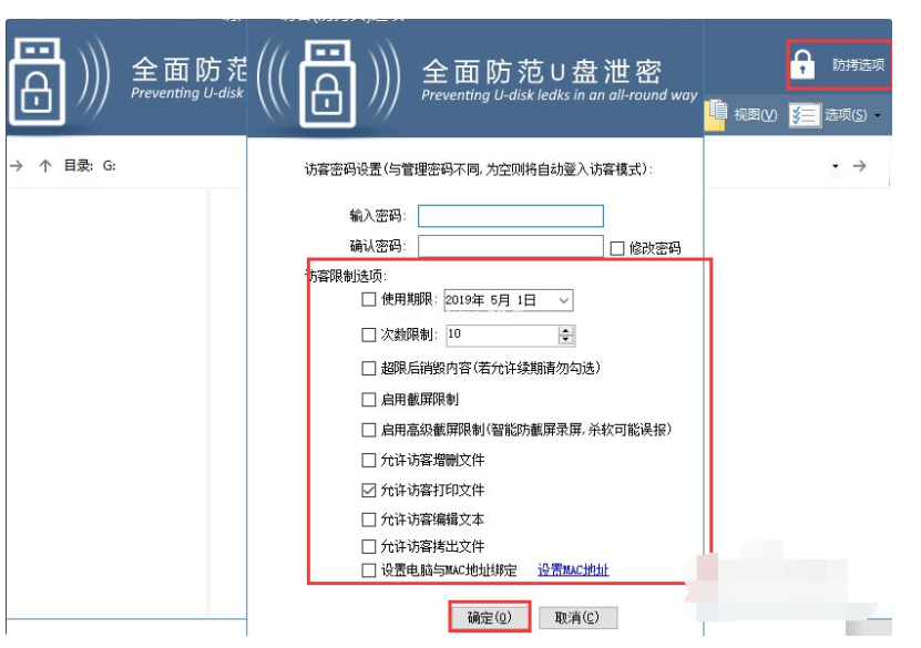 4、如果想要在普通模式下也可以對(duì)文件進(jìn)行操作,那么可以在管理模式下右上角點(diǎn)擊防拷選項(xiàng),在彈出的窗口中根據(jù)需要選中對(duì)應(yīng)的權(quán)限即可,最后點(diǎn)擊確定。