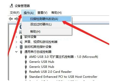 步驟6:我們再單擊上面的“操作”,彈出“掃描檢測硬件更改”;