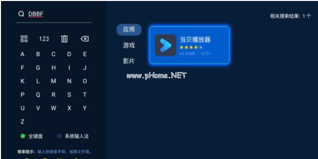 3.當貝市場下載好了之后,打開【搜索】欄搜“DBBF”,即可看到“當貝播放器”,