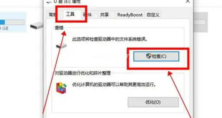 2、進(jìn)入U(xiǎn)盤屬性窗口,點(diǎn)擊“工具”下的“檢查”選項(xiàng);