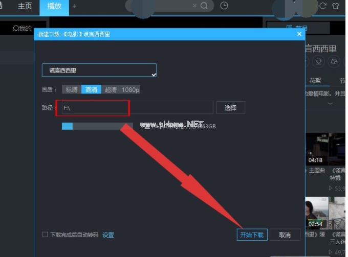 3、出現(xiàn)下載的界面,此時(shí)會(huì)讓你選擇電影的畫(huà)質(zhì)(越靠后清晰度越高),在下面會(huì)有一個(gè)系統(tǒng)的默認(rèn)下載地址,這時(shí)候就需要我們點(diǎn)擊右邊的目錄進(jìn)行自己調(diào)節(jié)下載目錄: