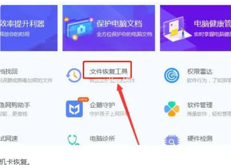 1、打開電腦管家,點(diǎn)擊工具箱,找到并點(diǎn)擊“文件恢復(fù)工具”;