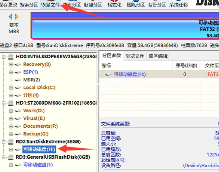 1、首先運(yùn)行DiskGenius軟件,在軟件中選擇丟失數(shù)據(jù)的U盤,點(diǎn)擊上方的"恢復(fù)文件"按鈕;