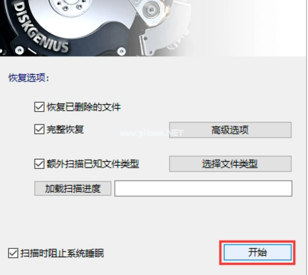 2、默認(rèn)勾選"恢復(fù)已刪除的文件",我們直接點(diǎn)擊"開始"按鈕;