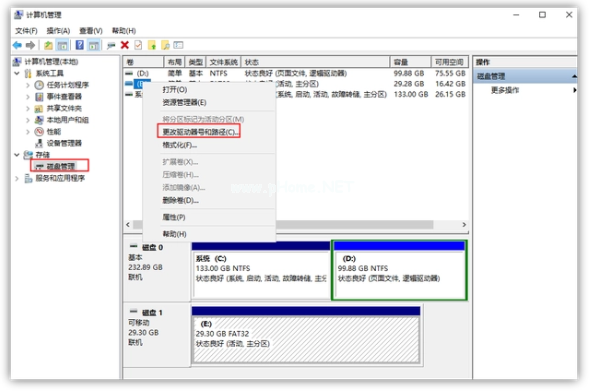 1、這個方法可以解決大部分U盤無法識別的問題。進入到計算機管理界面,在右側“存儲”的“磁盤管理”下,找到“可移動磁盤”,點擊選擇“更改驅動器號和路徑”;