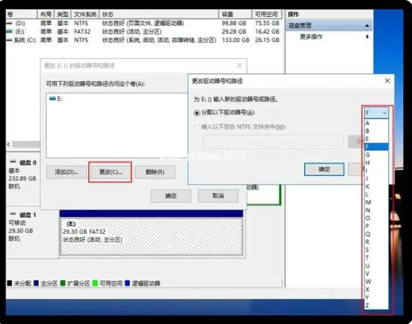 2、在彈出的窗口中點擊更改,隨便選擇一個未被占用的盤符,點擊確定后,電腦就會重新識別U盤并安裝相關驅動。