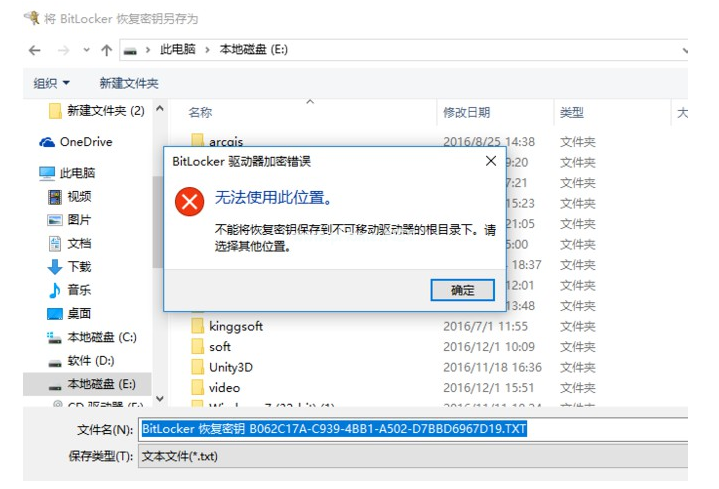 4、注意,不能把恢復(fù)密鑰保存在非移動(dòng)驅(qū)動(dòng)器的根目錄下,也不能保存在已加密的移動(dòng)磁盤中。