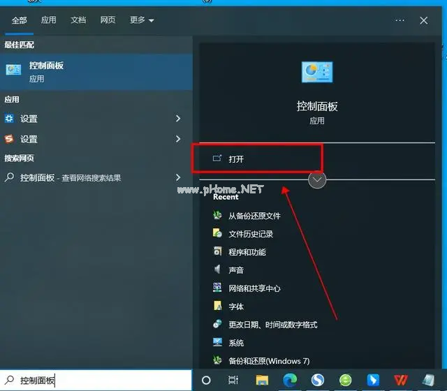 1、將U盤(pán)插入電腦后,搜索并點(diǎn)擊打開(kāi)“控制面板”。