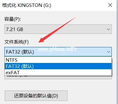 3、然后在彈出的窗口中,點(diǎn)擊文件系統(tǒng),在該欄中點(diǎn)擊選擇FAT32格式。