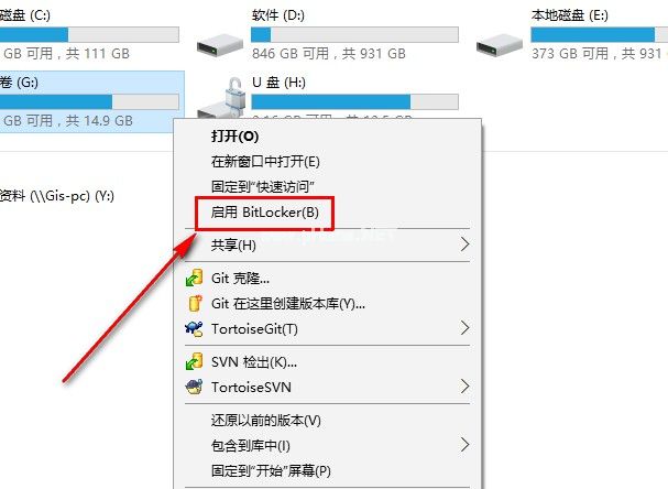 1、插入u盤到電腦usb接口,等待顯示出u盤盤符后,右鍵選擇u盤,點(diǎn)擊“啟用BitLocker”。