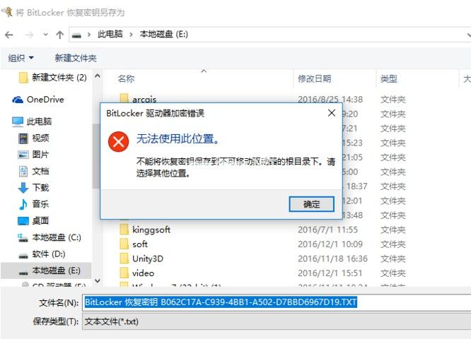 4、注意,不能把恢復(fù)密鑰保存在非移動(dòng)驅(qū)動(dòng)器的根目錄下,也不能保存在已加密的移動(dòng)磁盤中。